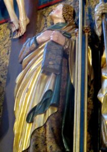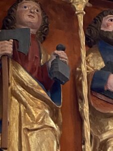 In der Kirche habe ich folgende Figur gesehen: Auf einem vierteiligen Kirchenbild mit geistlichen Herren habe ich eine Person mit einem Miniaturbuch entdeckt. In der linken Hand hält der Geistliche ein kleines Büchlein.